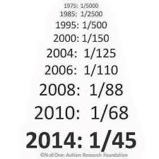 A new (2014) report from the Centers for Disease Control and Prevention and the National Center for Health Statistics, USAfound that 1- in- 45 children or 2.24% of children aged 3 through 17, met the diagnosis of autism spectrum disorder (ASD). This figure is a dramatic jump from earlier surveys, also conducted by the Centers for Disease Control (CDC); 1-in-68 in 2013 and 1-in-88 in 2010.