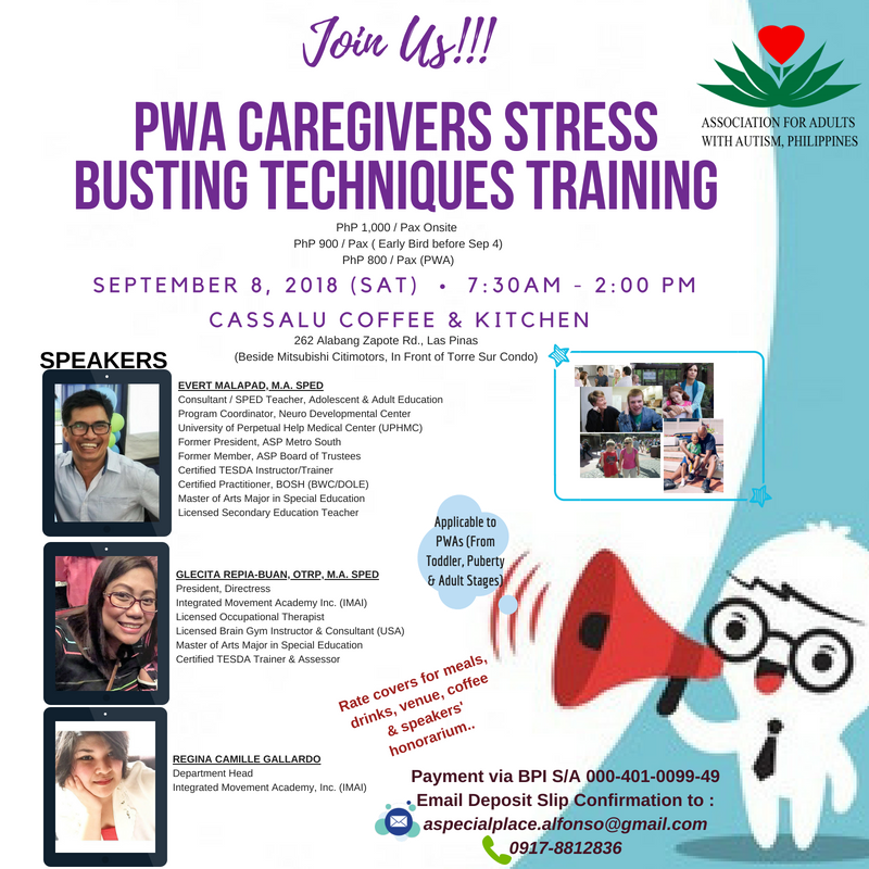 AAAP has come up with the PWA Caregivers Stress Busting Techniques Training to help assist parents/guardians when professional services are lacking or still underway since we know there are long waiting lists for services in many large metropolitan areas…..